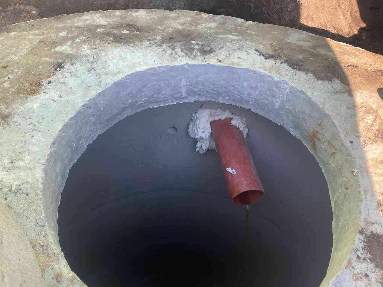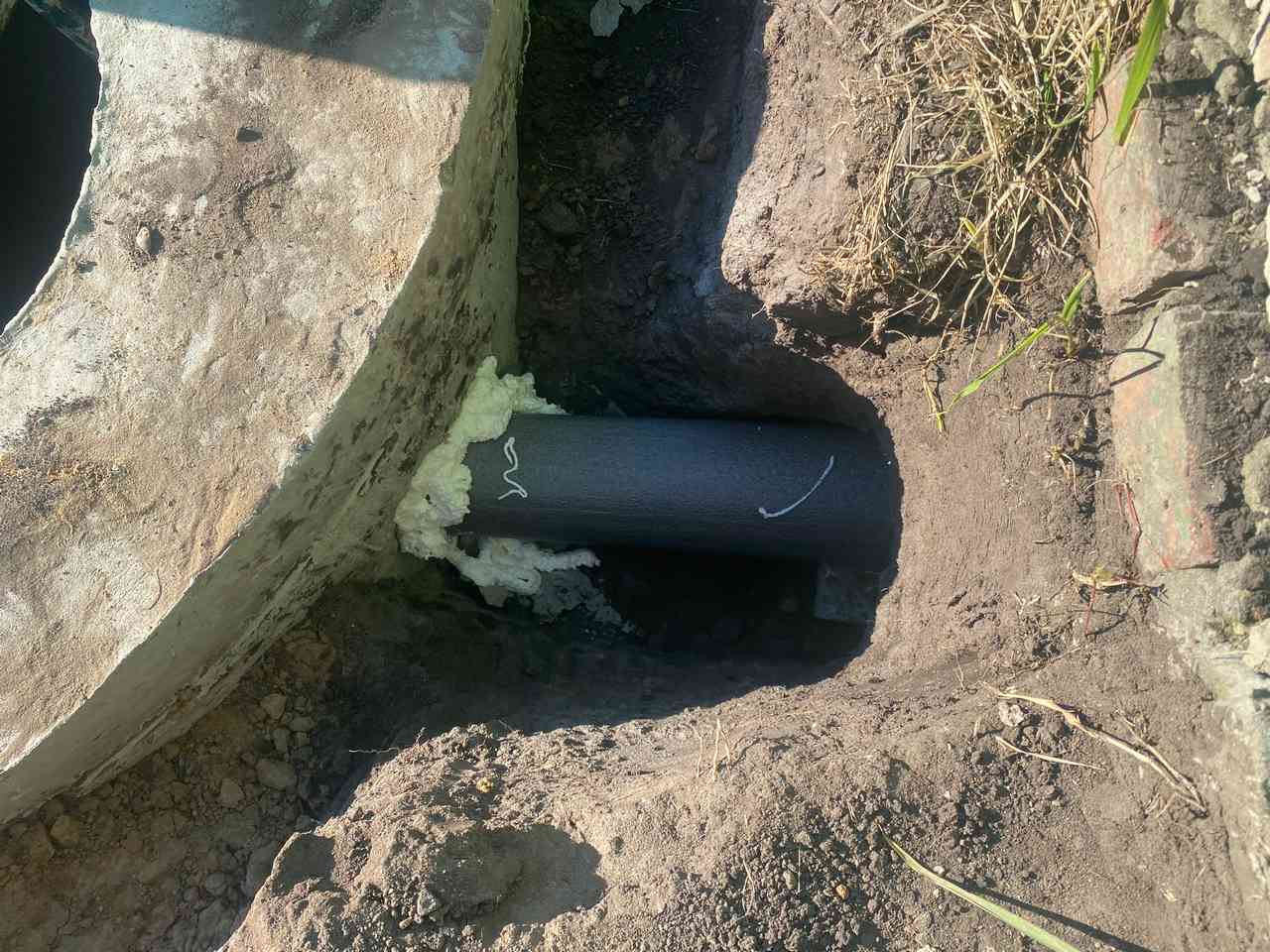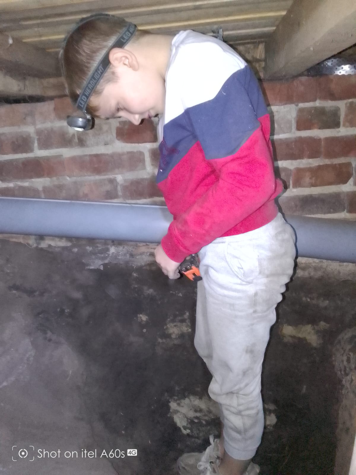 Монтируем трубы, он с Максом под полом, зацементировал доборное кольцо и люк/