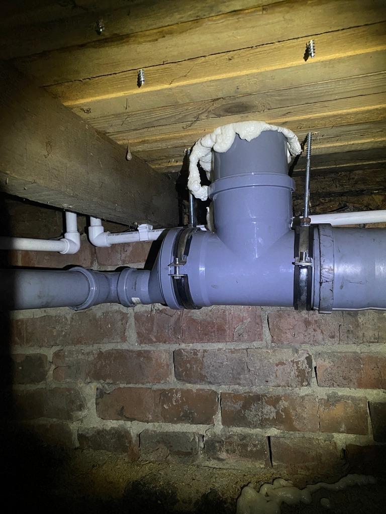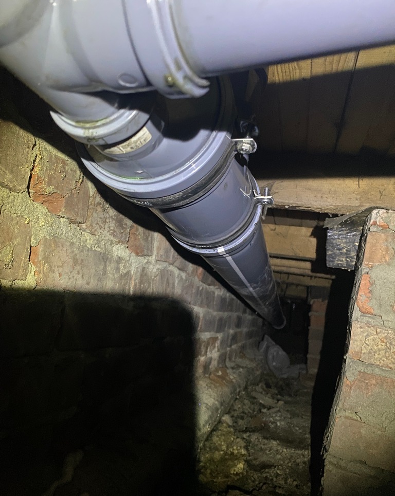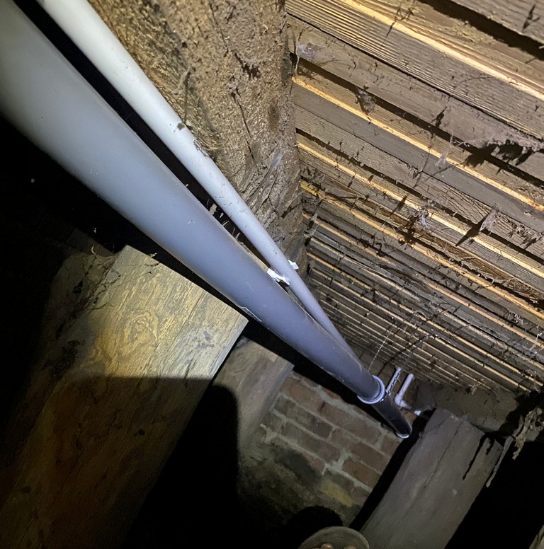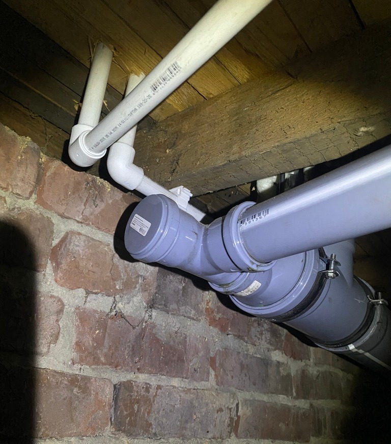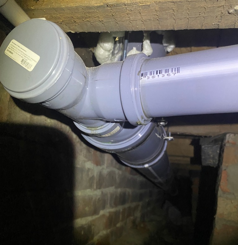 Монтируем трубы, он с Максом под полом, зацементировал доборное кольцо и люк/